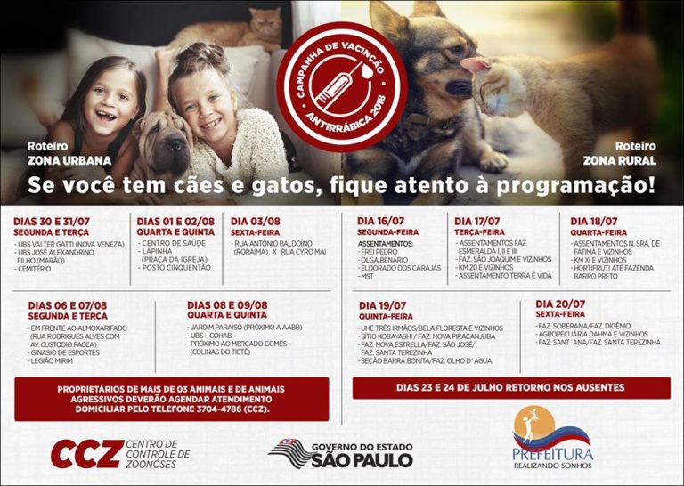 Campanha de Vacinação Antirrábica terá início no fim deste mês na Zona Urbana de Pereira Barreto