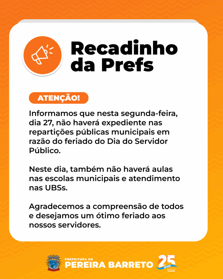Prefeitura de Pereira Barreto informa sobre a suspensão de expediente no Dia do Servidor Público