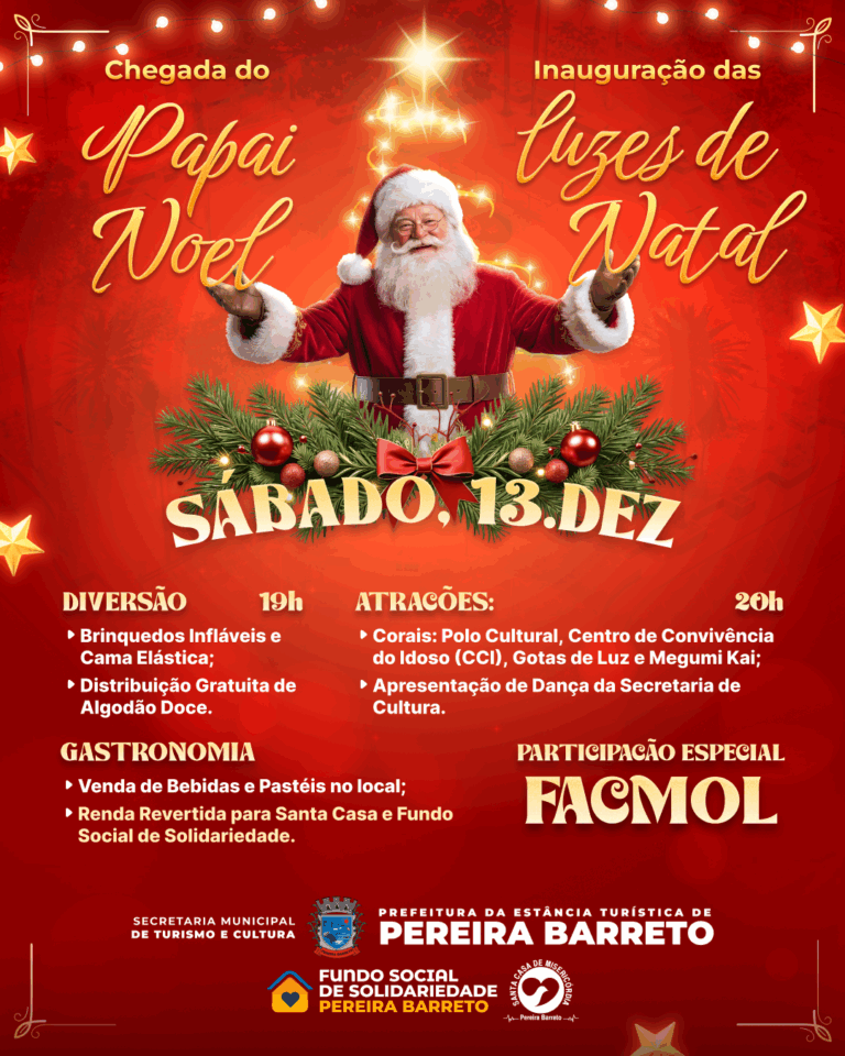 Pereira Barreto se prepara para a noite mágica de 13 de dezembro com o Natal Iluminado e chegada do Papai Noel