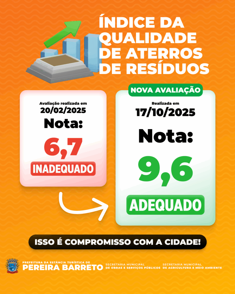A Prefeitura de Pereira Barreto celebra um marco importante na gestão de resíduos sólidos. O Aterro Sanitário Municipal, que em fevereiro deste ano havia recebido nota 6,7 da Companhia Ambiental do Estado de São Paulo (CETESB) e sido classificado como inadequado, acaba de atingir a expressiva nota 9,6, garantindo a classificação de Condições Adequadas e plena capacidade para receber os resíduos da cidade.