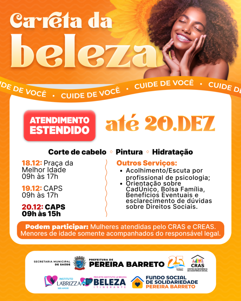 A Carreta da Beleza continua em Pereira Barreto com atendimento estendido até o dia 20 de dezembro, oferecendo serviços gratuitos voltados ao cuidado, à autoestima e à orientação social. A ação é destinada às mulheres atendidas pelo CRAS e CREAS, com atendimentos realizados em diferentes pontos do município.