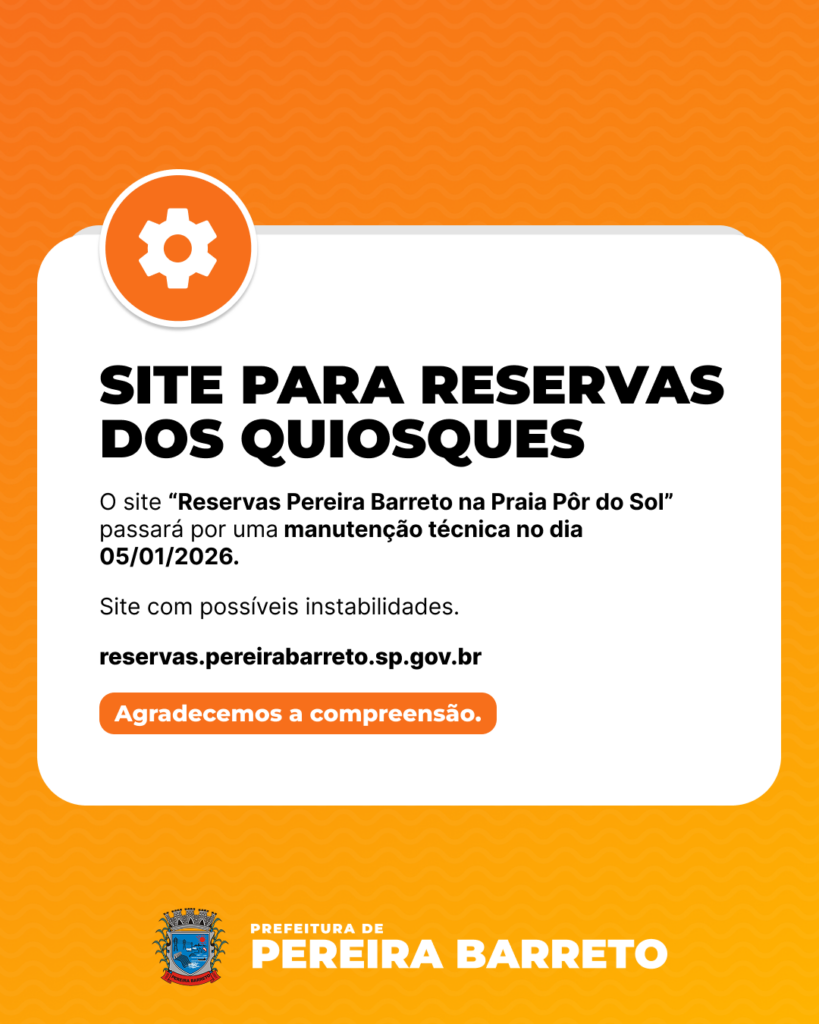 Por fim, a administração municipal reforça que o portal reservas.pereirabarreto.sp.gov.br é o único canal oficial para a realização de reservas, e agradece a compreensão de todos durante o período de manutenção.