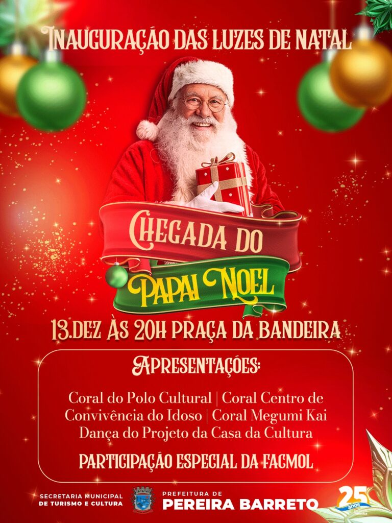 A Secretaria de Turismo e Cultura de Pereira Barreto prepara uma noite mágica para a população com a realização do evento “Natal Iluminado”, que marca oficialmente a abertura da temporada festiva no município. O ponto alto da celebração será a chegada do Papai Noel e a inauguração da deslumbrante decoração natalina.