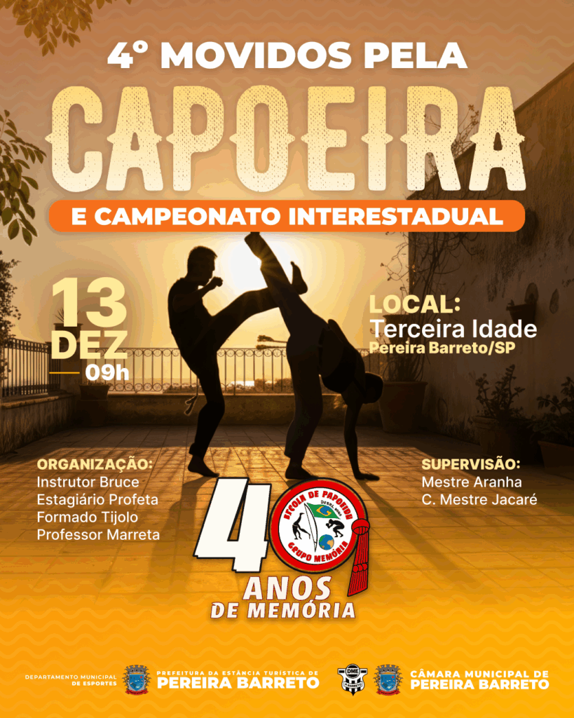 Pereira Barreto se prepara para sediar o 4º Movidos Pela Capoeira e Campeonato Interestadual. O evento é um convite à população para prestigiar a capoeira, uma modalidade que vai além do esporte, sendo uma valiosa manifestação cultural e de resistência.