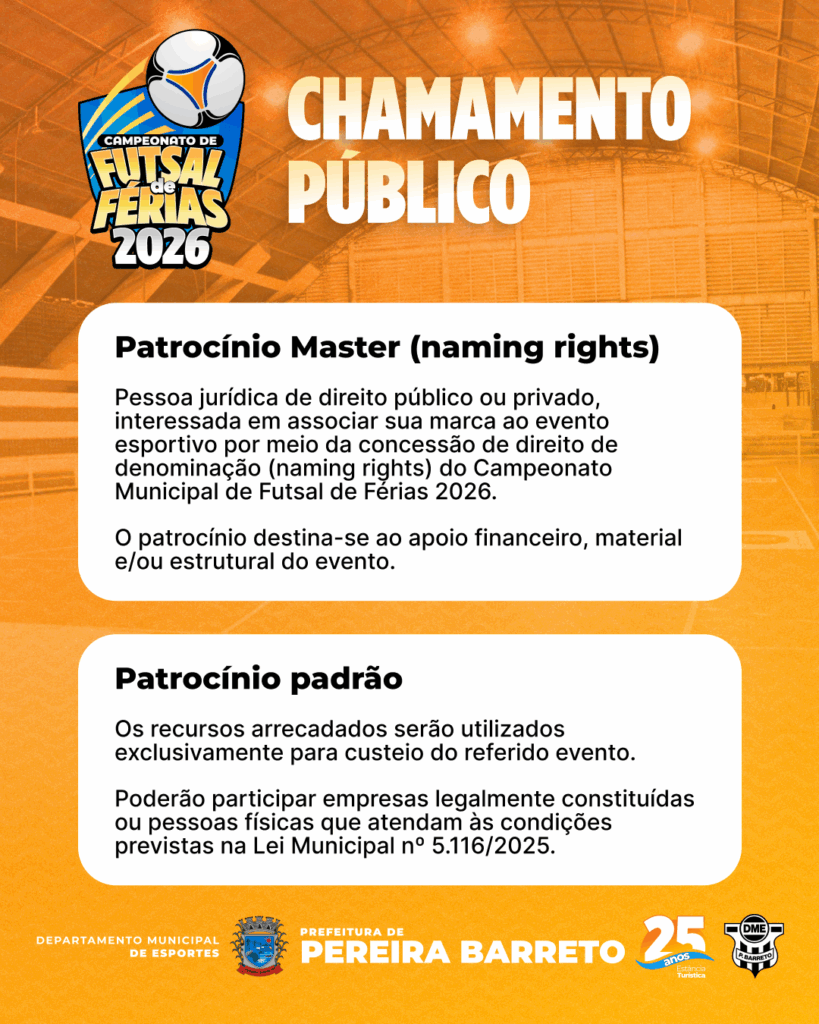 A Prefeitura Municipal da Estância Turística de Pereira Barreto, por meio do Departamento Municipal de Esportes, Lazer e Recreação, informa que estão abertos dois Chamamentos Públicos para a captação de patrocínios para o Campeonato Municipal de Futsal de Férias 2026.