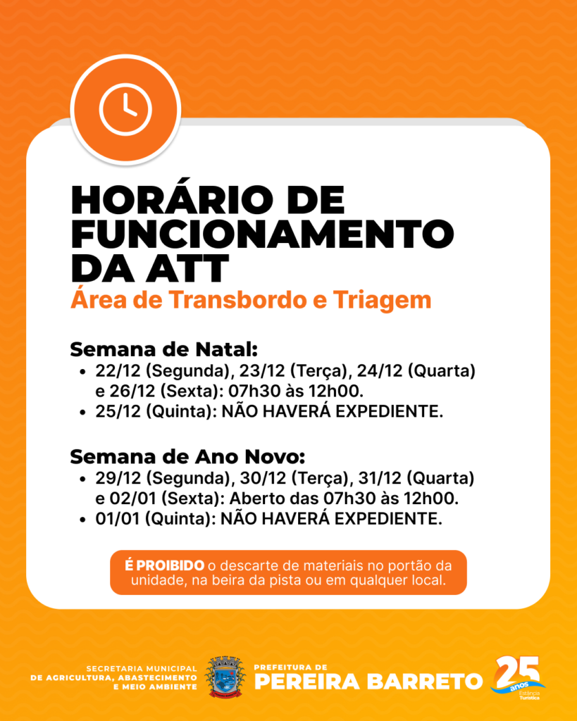 A Prefeitura de Pereira Barreto divulgou um comunicado importante informando a população sobre o cronograma de funcionamento dos serviços de recebimento de resíduos durante o período de final de ano. A orientação é para que os munícipes programem seus descartes com antecedência, evitando transtornos e práticas irregulares.