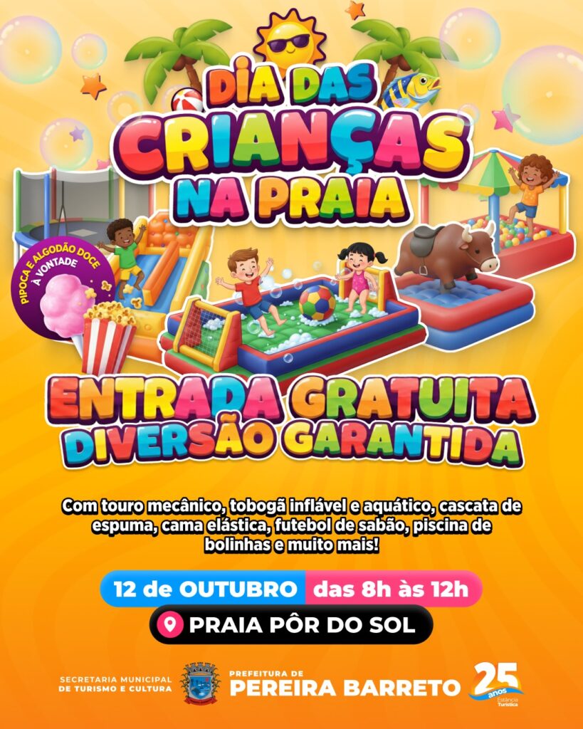 A Prefeitura de Pereira Barreto, por meio da Secretaria Municipal de Turismo e Cultura, promove no próximo domingo (12) uma manhã especial em comemoração ao Dia das Crianças. O evento será realizado das 8h às 12h, na Praia Pôr do Sol, com entrada gratuita.