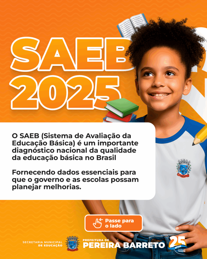 A Prefeitura Municipal de Pereira Barreto, por meio da Secretaria Municipal de Educação, informa a todos os Pais e Responsáveis que, no dia 30 de outubro de 2025, será realizada, em todas as escolas municipais, a aplicação do Sistema de Avaliação da Educação Básica (SAEB).