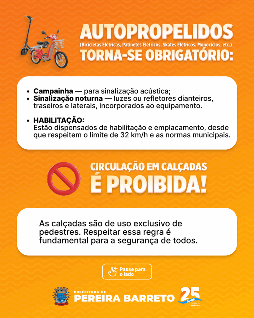 Segundo Reginaldo Auto, Diretor de Segurança Pública e responsável pelo trânsito em Pereira Barreto, o cumprimento das regras é essencial para preservar vidas. “É importante que todos os condutores de bicicletas elétricas, autopropelidos e ciclomotores respeitem as regras de trânsito, andando pela via correta e não utilizando calçadas, como os nossos calçadões. Tudo isso tem como foco principal a segurança dos pedestres”, destacou o Diretor.
