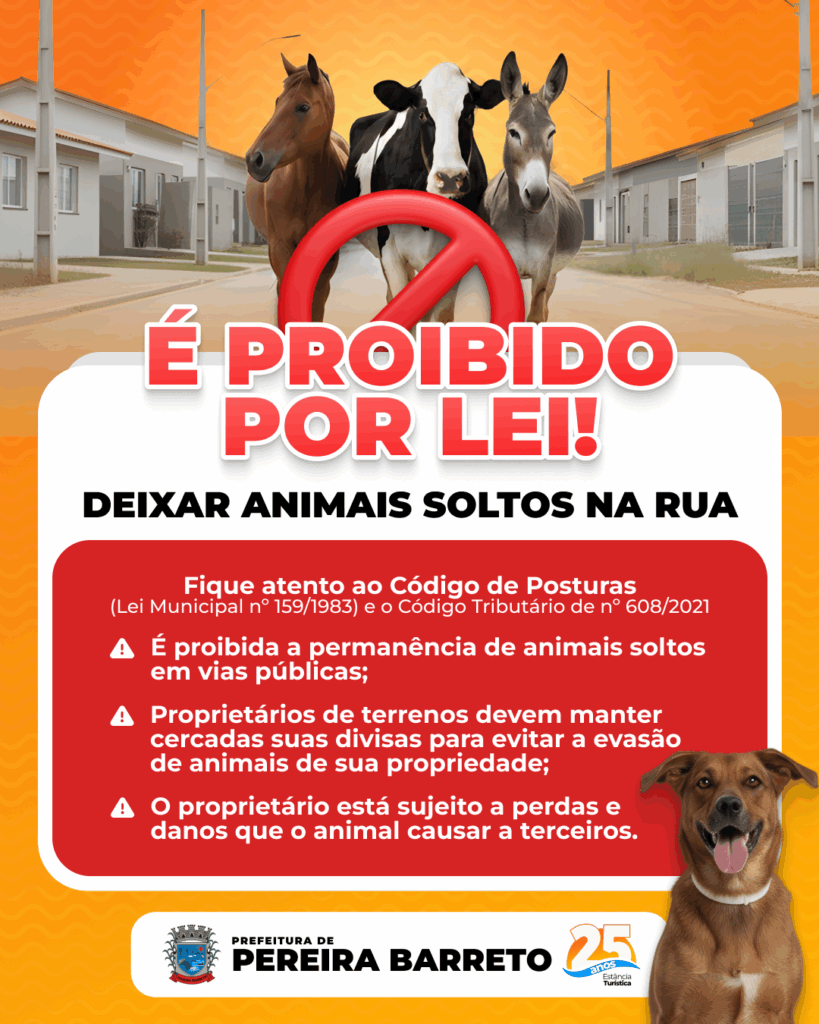 A Prefeitura Municipal de Pereira Barreto, por meio da Secretaria Municipal de Agricultura, Abastecimento e Meio Ambiente, vem a público notificar a população sobre a legislação vigente que proíbe o abandono e a permanência de animais soltos em vias e logradouros públicos. O objetivo é reforçar a importância do Código de Posturas Municipal, que estabelece normas de convivência e obrigações para os munícipes, visando a segurança, a ordem pública e o bem-estar animal.