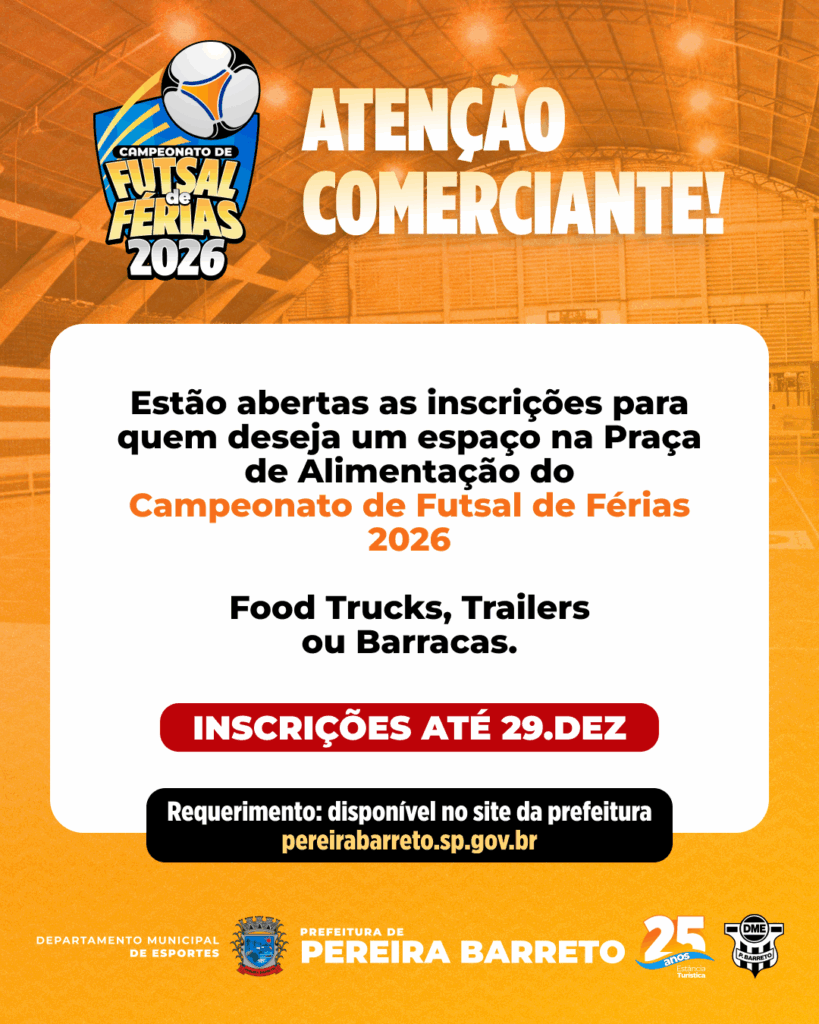 A Prefeitura Municipal da Estância Turística de Pereira Barreto, por meio do Departamento Municipal de Esportes, Lazer e Recreação, lançou um Edital de Chamamento Público para credenciar trailers e lanchonetes. O objetivo é selecionar estabelecimentos para atuar no Campeonato Municipal de Futsal de Férias 2026, que será realizado no Ginásio Municipal de Esportes “Stélio Maia”.