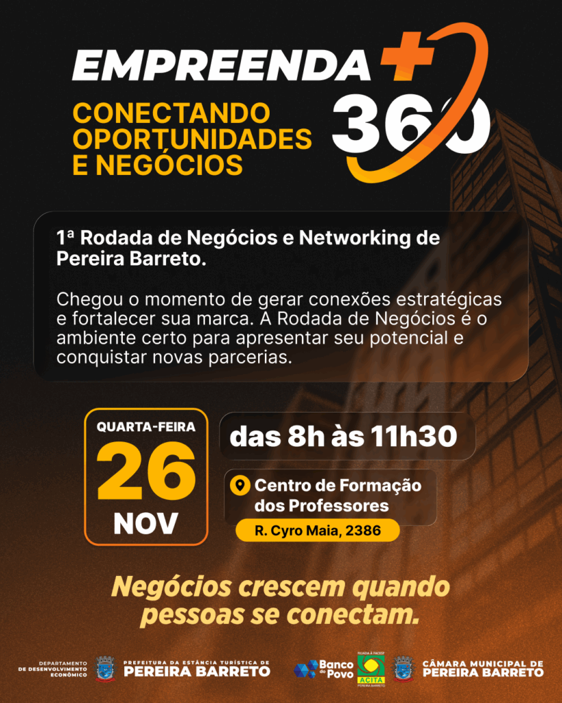 A Prefeitura Municipal de Pereira Barreto, por meio do Departamento de Desenvolvimento Econômico, em uma ação conjunta com o Banco do Povo, ACITA (Associação Comercial, Industrial, Turística e Agronegócios) e a Câmara Municipal, realizará a 1ª Rodada de Negócios e Networking do município, batizada de “Empreenda + 360: Conectando Oportunidades e Negócios”.